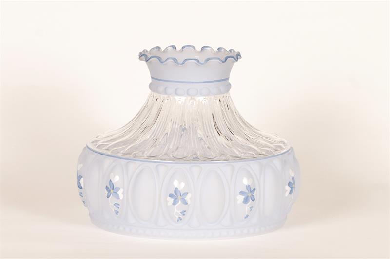 Aladdin Lamps 10" Glass Crystal Blue Meadow Shade, #M753 Hand-painted dainty blue flowers on a light blue crystal band is both elegant and charming. The shade combines both a blue tinted frosted and clear glass, which allows for the maximum light output while still producing a nice warm glow. Stunning when paired with Nickel or Chrome Table Lamps (new and old), clear or cobalt blue Short Lincoln Drapes. For use with Aladdin 10" under-burner shade rings (sold seperately) or any other oil, kerosene, or coal oil lamp with a 10" shade support. www.p65warnings.ca.gov.