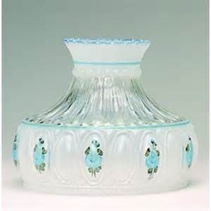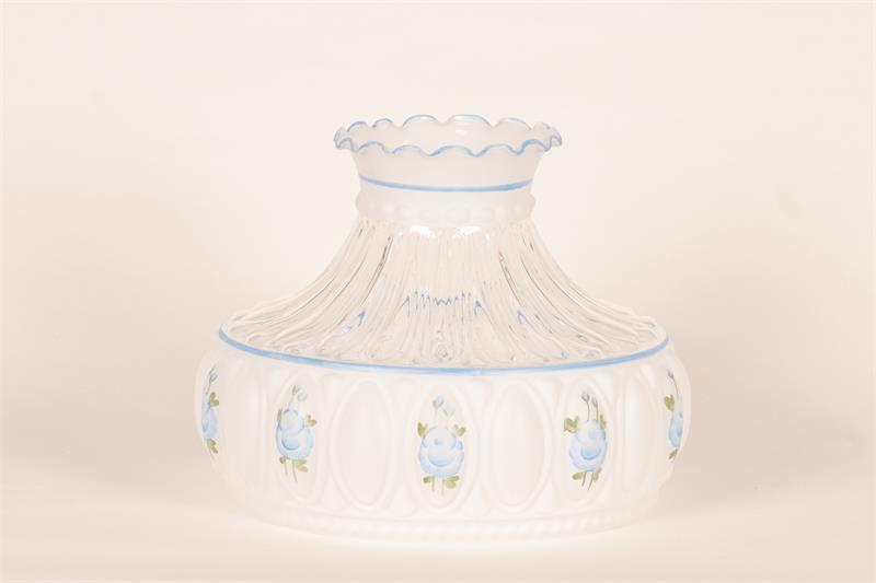 Aladdin Lamps 10" Glass Crystal Blue Rose Shade, #M750 This popular Crysal Rose shade features hand-painted blue roses with green accents on a frosted and clear shade. The shade combines both frosted and clear glass, which allows for the maximum light output while still producing a nice warm glow. Stunning when paired with a Nickel or Chrome Table Lamps, Clear or Cobalt Blue Short Lincoln Drapes. For use with Aladdin 10" under-burner shade rings (sold seperately) or any other oil, kerosene, or coal oil lamp with a 10" shade support.