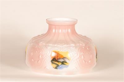 The Aladdin Swiss Mountain Shade was originally introduced in 1922 with the Aladdin Model 11 Table Lamp. The Swiss Mountain Scene is an elegant, ornate opal white shade with hand-painted mountain scene. Light blush color throughout the shade. Pair this shade with the Deluxe Table Lamp for an elegant setting. For use with Aladdin 10" under-burner shade rings (sold seperately) or any other oil, kerosene, or coal oil lamp with a 10" shade support.