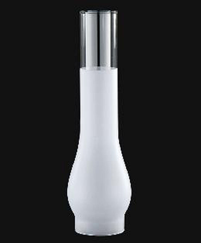 This chimney features frosting from the base to 3/4 of the way up the chimney. The frosted glass diffuses the light produced by the lamp, and produces a nice warm glow. This frosted chimney is also a good pick for electrified lamps, making the light bulb less noticeable.