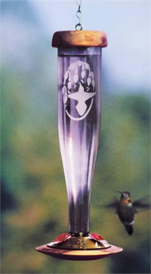 Our hummingbird lanterns feature a hand-lathed redwood base complete with brass accent ring containing three ruby anodized flowers. The bottle is beautiful art quality glass. This design is leak free and easy to clean and refill. 12" Tall, holds one pint. This item proudly made in the U.S.A.