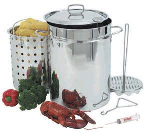 32-Qt. Stainless Steel Stockpot 12"d x 16.25"h 0.6 mm/22 Gauge Perforated Steam/Boil Basket & Vented Lid Perforated Poultry Rack/Lift Hook 12" Thermometer 50F - 750F 3-Piece Detachable Skewer Set 1-oz. Trial Seasoning Injector Size: 14.25" x 13.63" x 18.25" Weight: 12.22
