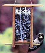 Beautifully designed with clean, classic lines and etched glass featuring bamboo design. Holds 5 cups of seed 12" Tall