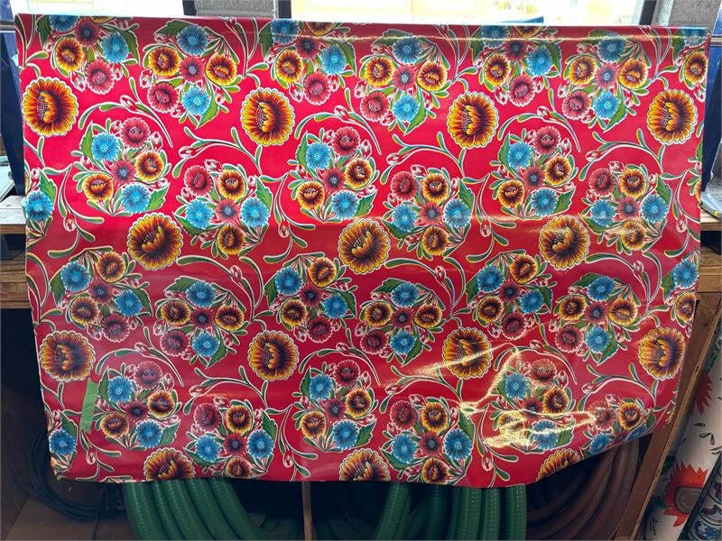 Blooms on Red Oil Cloth, Full BoltOilcloth has been around for over a century and when it comes to making a bold color statement anywhere in your home. Oilcloth is a long-lasting, sturdy product that comes in vibrant colors. The oilcloth of yesteryear was resin-coated vinyl and the finish sometimes cracked or flaked. The new version is made of hi-tech plastic that won't crack but has the same colorful shine. Oilcloth has a mesh backing, which means it can really hold a stitch. It can be used for anything that needs to be durable and colorful--tablecloths, upholstered dining room chairs, curtains, bibs, lampshades, tissue boxes, outdoor chairs, etc. Your only limited by your imagination! Oil Cloth measures 48" wide & a full bolt equals 12 continuous yards (36 feet) Don't see the pattern or color you want? Please let us know and we will order it for you!Download a sewing pattern with complete instructions that you can print out at home to make an adorable bib with these oil cloth materials courtesy of Oilcloth.com. Click Here