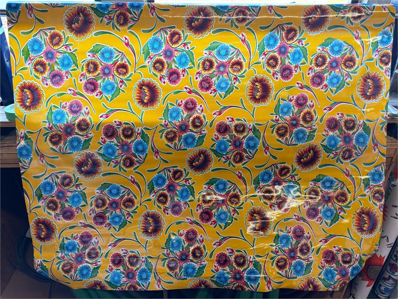 Blooms on Yellow Oil Cloth, YardageOilcloth has been around for over a century and when it comes to making a bold color statement anywhere in your home. Oilcloth is a long-lasting, sturdy product that comes in vibrant colors. The oilcloth of yesteryear was resin-coated vinyl and the finish sometimes cracked or flaked. The new version is made of hi-tech plastic that won't crack but has the same colorful shine. Oilcloth has a mesh backing, which means it can really hold a stitch. It can be used for anything that needs to be durable and colorful--tablecloths, upholstered dining room chairs, curtains, bibs, lampshades, tissue boxes, outdoor chairs, etc. Your only limited by your imagination! Oil Cloth measures 48" wide & a full bolt equals 12 continuous yards (36 feet) Don't see the pattern or color you want? Please let us know and we will order it for you!Download a sewing pattern with complete instructions that you can print out at home to make an adorable bib with these oil cloth materials courtesy of Oilcloth.com. Click Here