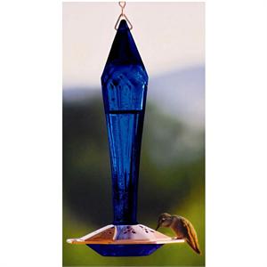 The faceted glass hummingbird feeder is brilliant in color and contemporary in style. Features a finely crafted copper base which allows hummingbirds to perch or hover while feeding through the open cut sunlit ports. This feeder is easy to fill and clean and is leak free. Comes with nectar recipe. This item proudly made in the U.S.A.