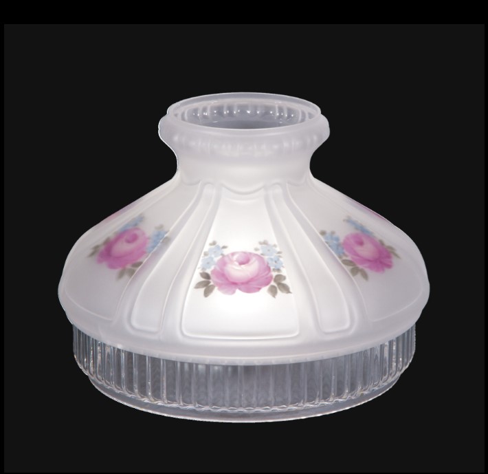 This reproduction style glass lamp shade features hand blown satin crystal and clear shade. Hand painted rose pattern. Can be used on Aladdin mantle lamps with 10″ shade ring. The 10" base diameter fits a wide variety of non-electric table lamps such as Aladdin, Rayo, Miller, Bradley and Hubbard (B & H), and many others. 8" height makes this shade well portioned with or without a glass chimney.