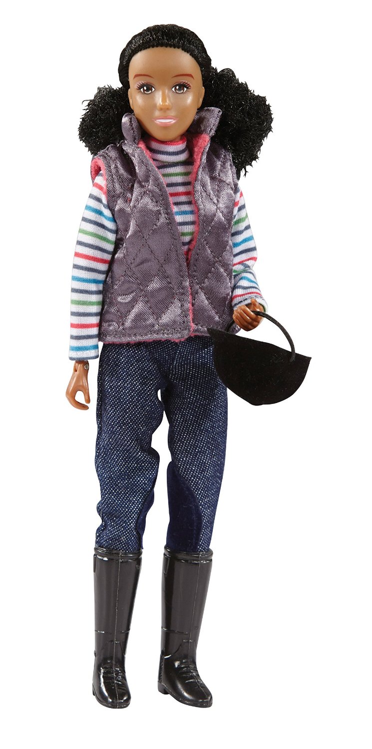 Nadia is dressed to school horses in denim breeches, pullover shirt with quilted vest, helmet and tall boots, Set includes canvas tote bag with ribbon accents. 8" tall Nadia doll is poseable and designed to sit and ride on Traditional Size Breyer Horse Models. Brushable hair.