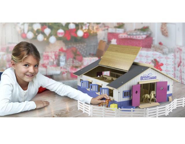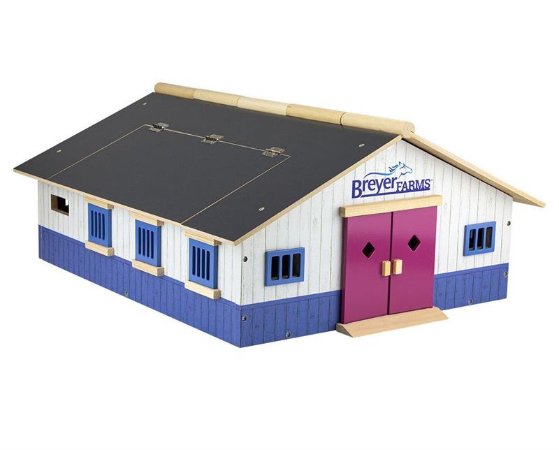 Breyer Farms Deluxe Wood Stable comes complete wWith unique lift-able roof panels, working doors and windows, and 7 stalls, the Breyer Farms Stable allows for engaging play from every angle. Whether you’re dreaming of a lesson stable or a backyard barn, this set comes with everything needed: 2 Stablemates scale horses, 12 pieces of fencing, feed bag, water trough, hay bale and sticker sheet to personalize the stable. Wood barn measures a generous 28"L x 16.34"W x 8.625"H.