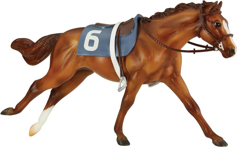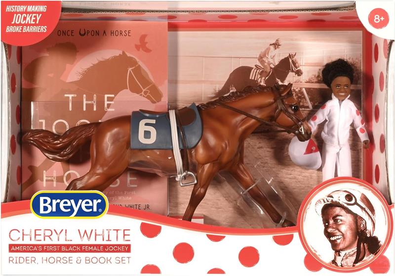 This gift set includes a 1:12 scale genuine Breyer model horse of Jetolara, race saddle and bridle, and fully-posable figure of Cheryl.