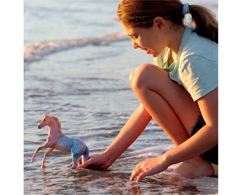 Dip her in warm water to see her markings, hooves, mane, and tail change color! After her swim, dress her in the shimmery mermaid tail blanket, and finish off her look by brushing her hair and putting on her crown.