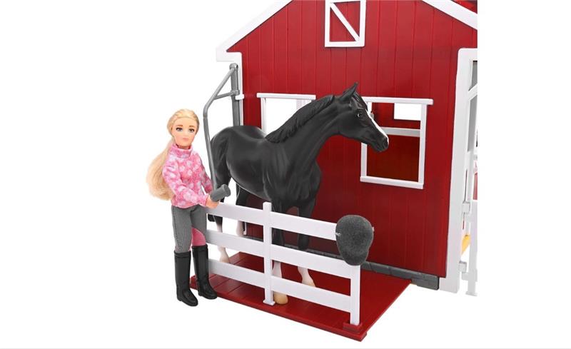 Included in this stable set is a beautiful 1:12 scale Freedom Series buckskin Quarter Horse; four fencing sections; attached saddle racks and bridle hooks; and movable ladder.