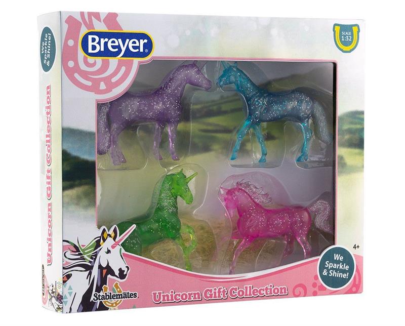 Authentically sculpted, these translucent and sparkly Stablemates unicorns come in fun fantasy colors, with glittery manes and tails. Just add your imagination and have fun! Breyer's #6048 Unicorn Gift Set comes with 4 model horse unicorns, sculpted in 1:32 scale. Ages 4 and older.