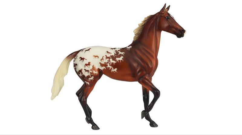 A flaxen red chestnut blanket appaloosa pattern spices up this athletic sport horse sculpted by a long-time Breyer equine artist admired for her detailed work. How many different Breyer horses can you “spot” in his coat?