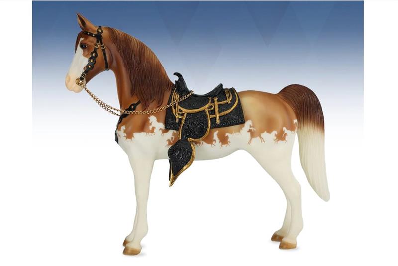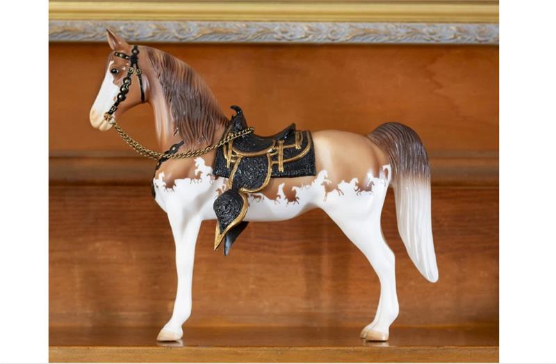 The horse that started it all! Sculpted by artist Chris Hess to originally adorn a mantelpiece clock, this iconic model has never looked better. He leads our 75th anniversary collection with a splashy red dun pinto coat, complete with his saddle, bridle, and breastcollar accented in gold. Look closer and you'll find dozens of tiny Breyer horses hidden in his pattern!