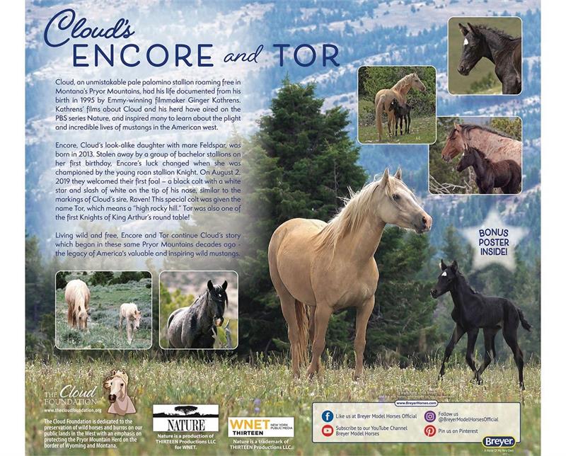 Filmmaker Ginger Kathrens has documented the mustangs of Montana’s Pryor Mountains for decades, including the palomino stallion Cloud and his family. Encore, Cloud’s look-alike daughter, was born in 2013. After being stolen by a group of bachelor stallions as a yearling, her luck changed when she was championed by the young roan stallion Knight. In August 2019, Encore and Knight welcomed their first foal, Tor – a black colt with a white star like Cloud's own sire Raven. Living wild and free, Encore and Tor will continue Cloud’s story that began in those same mountains decades ago.
