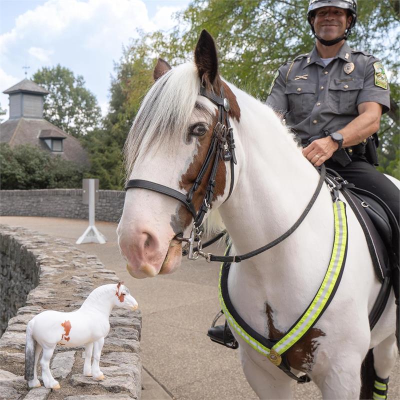 When your duties include patrolling over 1,200 acres of the horse capital of the world, of course you do it from horseback! The Kentucky Horse Park’s Mounted Police team does everything from security checks and greeting the public, to writing citations and directing traffic – all from the saddle. Naturally, the officers need safe, level-headed mounts that are also great with people. Meet Hytyme Legend, owned by Jim Elliott, and the KHP’s newest and youngest equine officer! He joined the team in 2021, and is partnered with Officer Rakow. Mounted Unit Commander Captain Rakes shares that Legend is “calm, level headed, and has a kind disposition which makes him a great ambassador to the Kentucky Horse Park.”