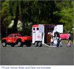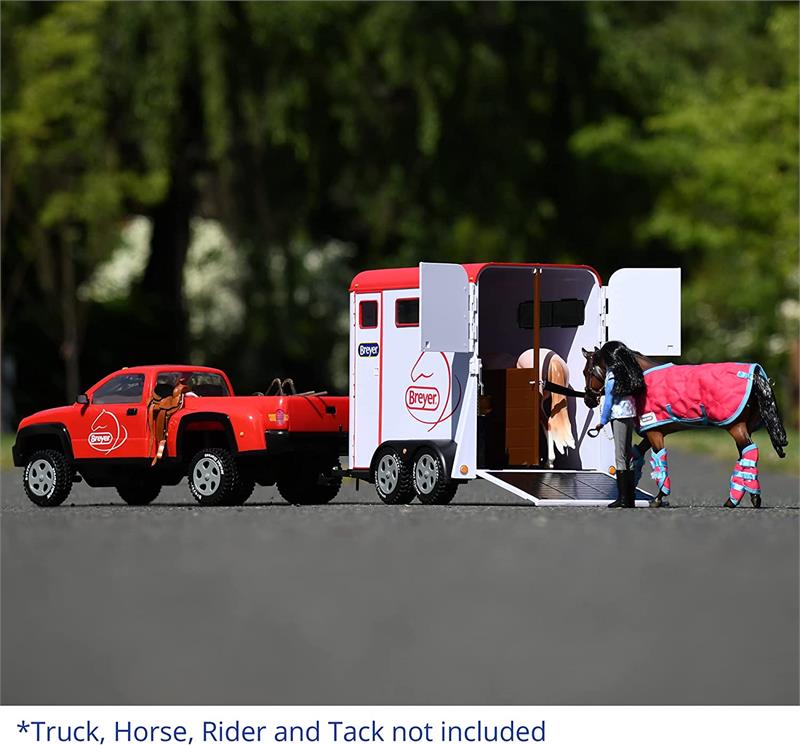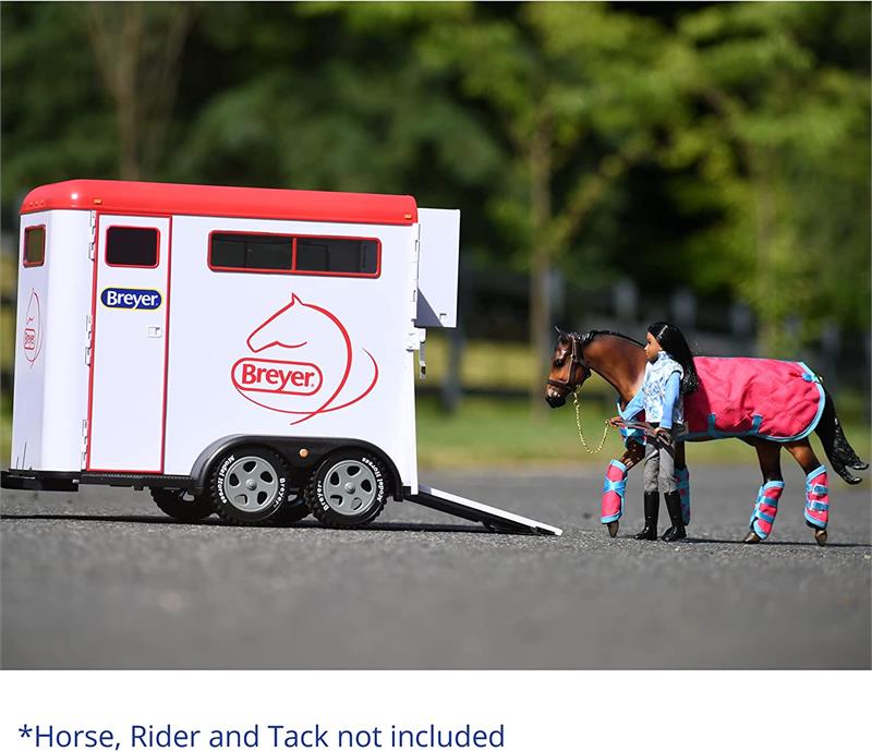 It's time to hit the road with your model horses! This authentically-detailed traileris perfect for all of your Breyer Traditional® Series horses and looks great parked next to your Breyer barn. It features room for two horses, with stalls separated by a divider, padded rear chains, two back doors with Dutch openings, four working tires, a side door, and a hitch! It can be hitched to the Breyer Dually Truck (sold separately). Let the adventures begin!
