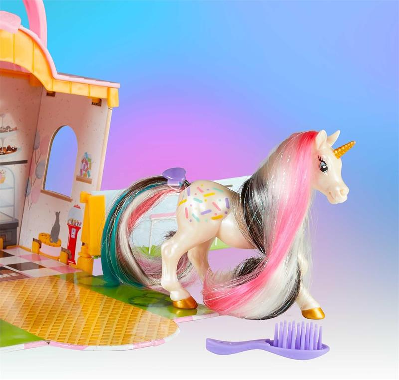 Playset includes Nea the unicorn, take-along shop with accessories and stickers, colorful hair extension with clip, and brush - 10 pieces in the complete set!