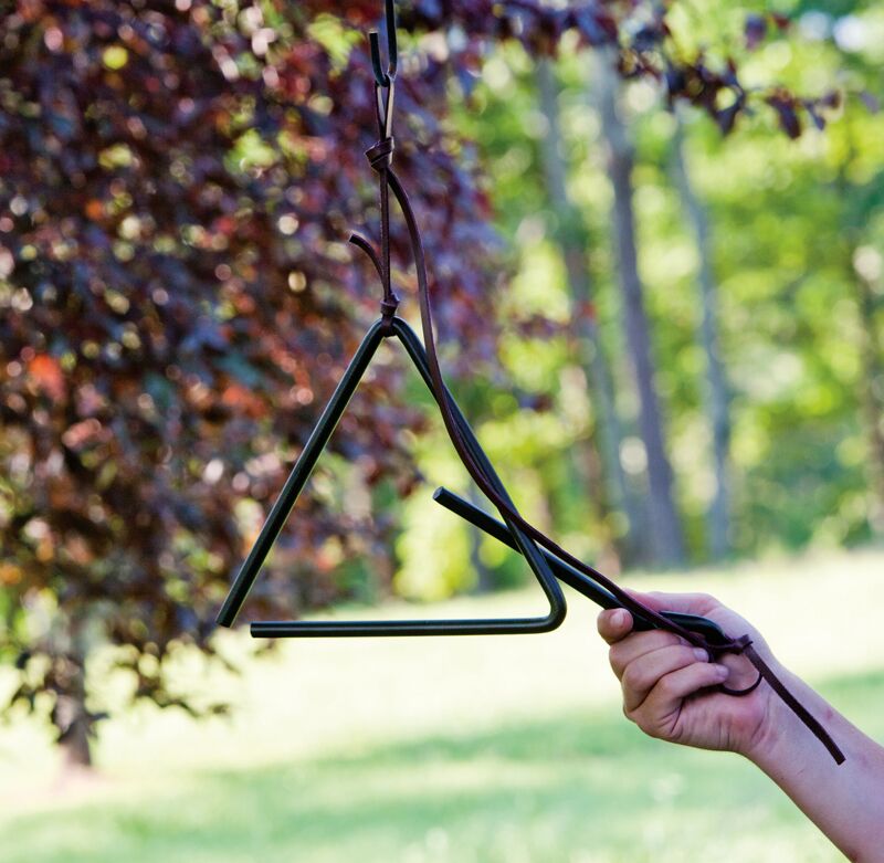 All Steel Chuckwagon Triangle Bell can be heard by near and far when dinner is ready. A true Chuckwagon necessity. The Chuckwagon Dinner bell has an all steel bell and striker, and comes with a black leather hanging strap. Creates an unmistakable sound.