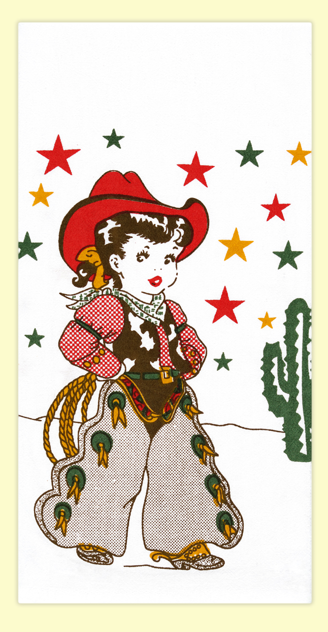 No country kitchen would be complete without this cute, vintage 1940s Cowgirl flour sack towel. She'll look right at home on any home on the range, cabin, farm house, or chuckwagon. This cute Cowgirl towel will also make a cute quilt square or pillow! 100% Cotton Flour Sack towel measures 17" x 24"