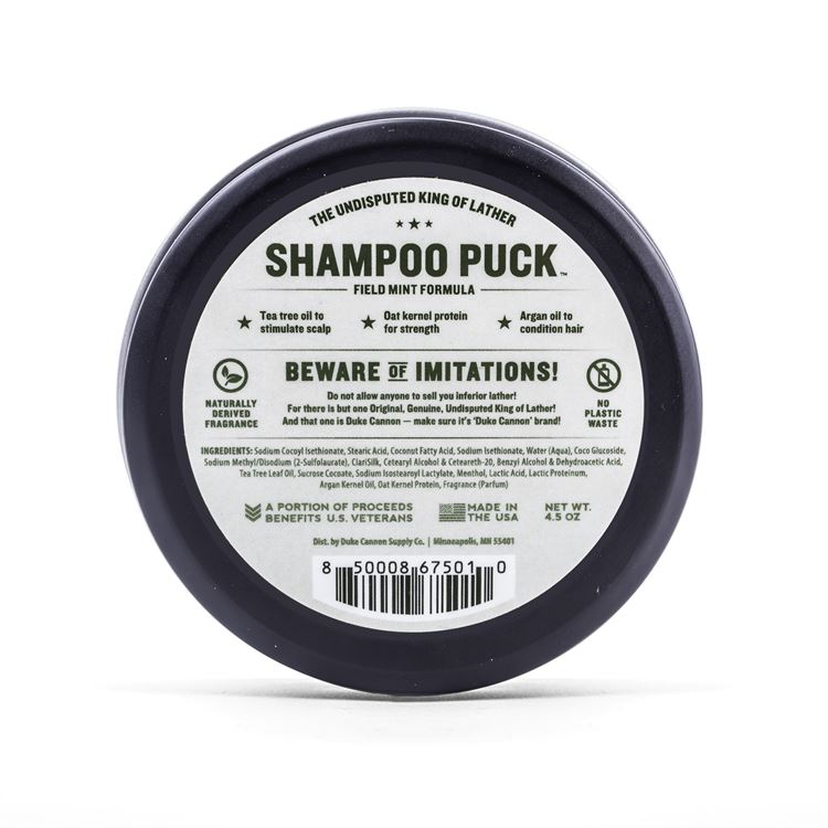 In the history of lather, there has never been a more important moment than right now. Duke Cannon, the Undisputed King of Lather is ushering in a new age of lather with the launch of our Shampoo Puck, a super-concentrated, premium formulated, solid bar of shampoo that smells better and lathers bigger than the rest. Weighing in at 4. 5 oz., they're built to outlast multiple bottles of that liquid stuff without leaving any plastic residue behind. Packed full of essential oils, naturally derived fragrances, and big, bold lather.