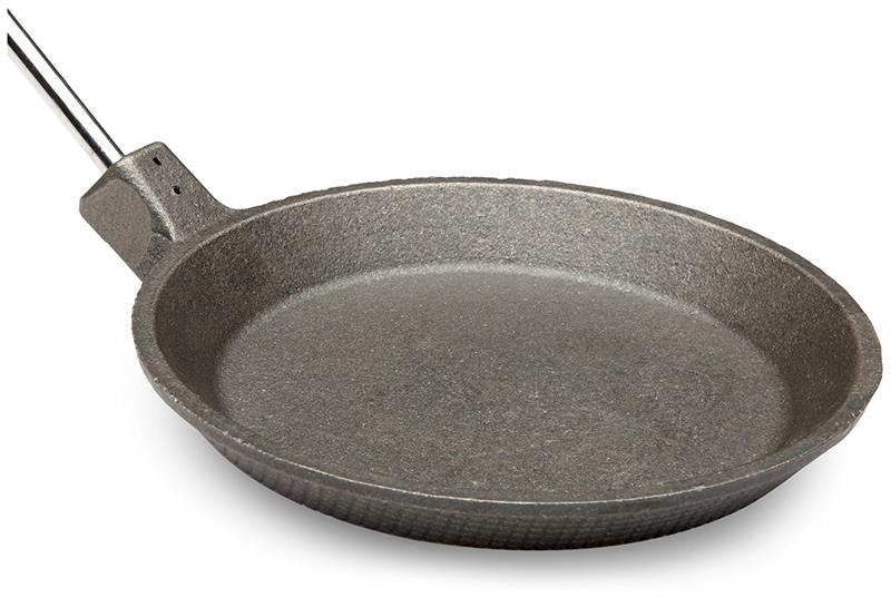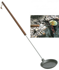 With a name like "family campfire skillet", you may be surprised to know that it's only 6" diameter and not a big old 18" frying pan. How are you supposed to feed a family with that? The idea is to help introduce outdoor cooking to kids. We take the small skillet and attach a long wood and steel handle so the child can try cooking eggs, sandwiches and pancakes. 6" diameter skillet, overall length 39", 21" wood handle