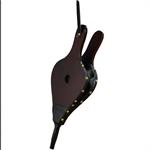 Hand-operated wooden bellows. Dark wood finish with black studded accents and nozzle.