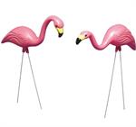 High quality plastic pink flamingos for all weather durability. Color will not fade and the galvanized steel legs will not rust. Two poses included - head up and head down. Each flamingo measures 12 In. W. x 4.5 In. D. and has a 27" stake.