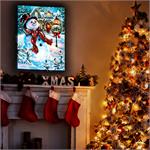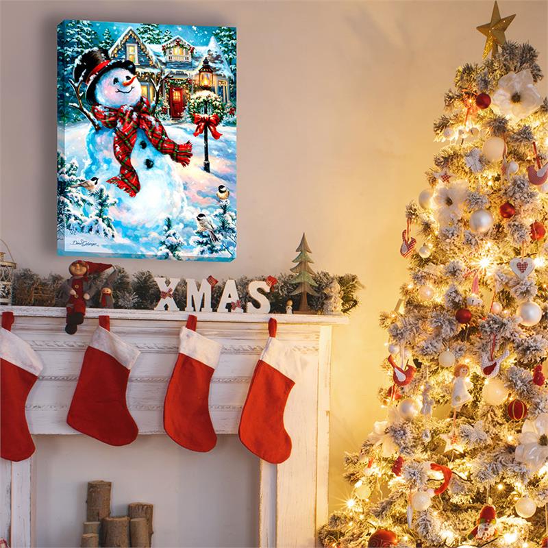 Illuminated wall art by Dona Gelsinger. Features a festive Snowman, complete with tartan plaid scarf, black top hat, and buttons made out of coal. Blue traditional farmhouse with Christmas lights sits in the background.
