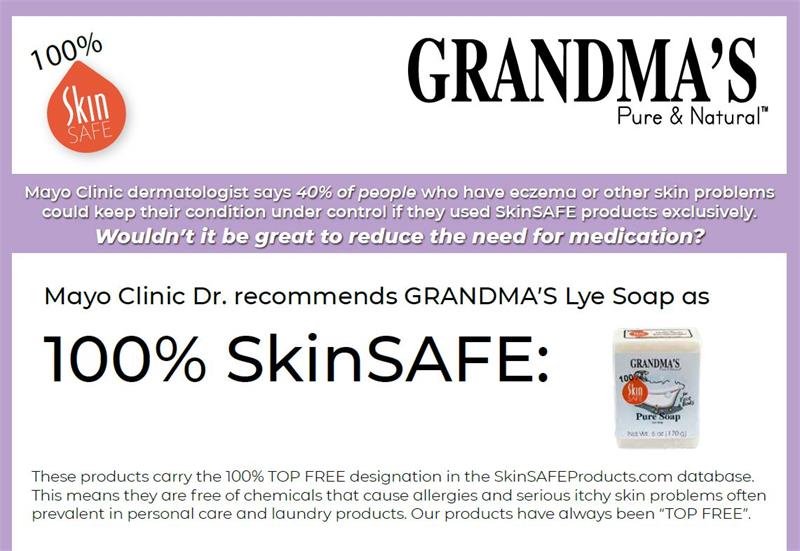 Grandma's Lye Soap Bar - Best Selling, All Natural SoapNo detergents, dyes, fragrance or other additives. Just pure soap. Clinically tested to be safe and mild on skin. SkinSafe rating of 100. Great for dry, itchy winter skin. Pure mild soap fomula used daily by folks for hundreds of years. Use Grandma's soap to clean your skin, dirty hands, laundry, and more. Pure and Simple Ingredients make up a bar of Grandma's Lye Soap:Lard (food grade), Water (aqua), & Sodium Hydroxide (lye) with Retained Glycerin 6 oz. bar is economical and lasts about a month with regular use. Our customers like to use Grandma's Lye Soap for rashes, hives, poison ivy, insect bites, itchy skin, etc. This item proudly made in the U.S.A.