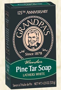 Grandpa's Soap Company Original Wonder Pine Tar SoapWe offer Grandpa's Pine Tar Soap in two different bar sizes: medium bar and large bath bar. Please use the pull-down menu to make your selection. Grandpa's Pine Tar bar soap is the original wonder soap. Ideal for showering, shampooing and facial grooming, this 3-in-1 wonder soap is made with natural pine tar oil to deeply cleanse, deodorize and moisturize from head to toe. For many years, folks have found that pine tar soap is beneficial in treating the scales of Psoriasis, Dandruff, Eczema, and other skin irritations. And don't worry, Grandpa's Pine Tar soap lathers white! Grandpa’s “Wonder” Pine Tar Soap has been manufactured and sold continuously since 1878. Ingredients in Grandpa's Wonder Pine Tar Soap Bar:Sodium Palmate, Sodium Cocoate / Sodium Palm Kernelate, Water (Aqua), Glycerin, Pinus Palustris Wood Tar, Sodium Chloride, Sodium Gluconate No Phthalates, Sulfates, Parabens, EDTA, Glutens, Animal By-Products, Artificial Fragrances or ColorantsIngredients in Grandpa's Pine Tar are certified Gluten Free by the Celiac Support Foundation, FSC Certified Environmentally Friendly, Sodium Palmate made with palm oil from Rainforest Alliance CertifiedTM farms, Certified Cruelty Free, and comes packaged in recyclable packaging. This item proudly made in the U.S.A.