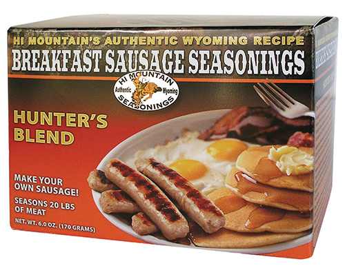 Nothing beats fresh, homemade breakfast sausage! It's fun and and easy to make. With our Sausage Seasonings you are in control. Make your sausage using 100% pork or mix pork with turkey or wild game–deer, elk, buffalo, antelope. Make patties, links or leave it ground. With Hi Mountain's quality seasonings and your personal touch you won't settle for anything but homemade again. Each Hi Mountain Jerky Hunter's Blend Breakfast Sausage Seasoning kit seasons 22 lbs of meat, one lb at a time if you choose.