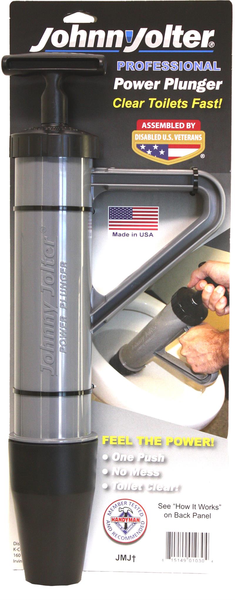 Johnny Jolter Professional Power Plunger #JJR-304Standard toilet plungers generate little pressure but can create quite a mess. The Johnny Jolter Power Plunger uses the power of water pressure to clear even the most stubborn clogs within seconds and without making a mess. It fits snugly into all residential and commercial toilets of any type or size. Simply retract the power plunger handle drawing water into the unit. Pushing the handle down creates a powerful clog busting force that immediately dislodges most clogs. The unit is 20 1/2” long and has been ergonomically designed for comfortable use. Easily disassembles for quick cleaning after use. Made in the USA by disabled U.S. Veterans. HOW JOHNNY JOLTER PROFESSIONAL PLUNGER WORKS: