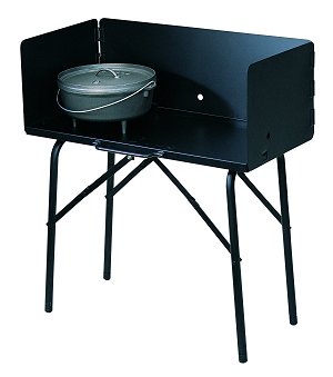 so your cooking will always be on the level. (Adjustable to a maximum of ) Deck is designed with an integral clean/sweep deck opening at the back left corner. Tall, 12" removable windscreen slides into clips located under the deck when collapsed for storage. Rugged all-steel construction makes this the toughest Dutch Oven Cooking Table on the market. High temperature black finish for lasting durability. Designed with a combo toolbar/handle that assures you'll never mislay a utensil,