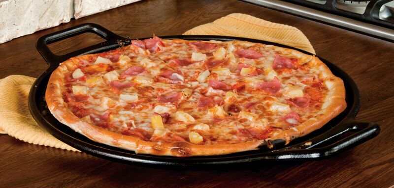 Lodge Logic 14" Pizza / Roasting Pan Pre Seasoned Cast Iron #P14P3 American Made Cast Iron BakewareThe Pizza/Roasting Pan from Lodge Manufacturing gives your pizza a golden crust every time and the heat retention properties of cast iron keep it piping hot until the last slice. The even heat distribution of cast iron enhances the flavor of roasted vegetables, pork chops, chicken and beef. The seasoned 14inch pan with loop handles features even heating and excellent heat retention for golden pizza crust every time. Recipe card included. About Lodge Manufacturing, the largest USA based Cast Iron Cookware maker:
