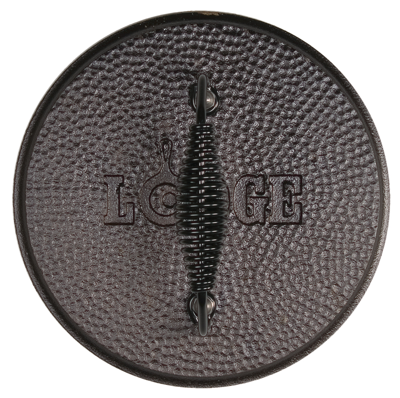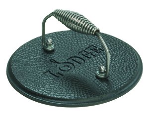 Lodge Cast Iron Round 7.5" Diameter Bacon Press #LGPR3 Pre-Seasoned American Made Cast Iron CookwareOur round grill press is perfect for using in Lodge's round skillets for pressing unwanted fats from meats or eliminating curl from bacon. Nice and heavy it is designed with a cool grip spiral handle and hammered finish. About Lodge Manufacturing, the largest USA based Cast Iron Cookware maker: