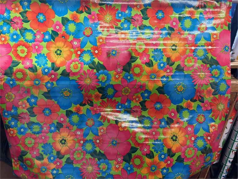 London on Light Blue Oil Cloth, Full Bolt on 12 Yards. Oilcloth yardage that brings to mind the Swingin' 70's in London. Groovy, baby! Great big flowers popping and bright colors inspired by Carnaby Street.