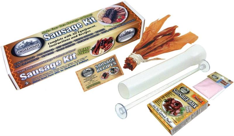 Smokehouse Products Complete Sausage KitThe Smokehouse Products brand Complete Sausage Kit is very easy to use. The complete sausage kit includes everything you need to make homemade sausage from beef, pork, venison, elk, bear, and more with ease.This complete home sausage kit is the ideal companion to your Home Electric Smokehouse.The Smokehouse Products Complete Sausage Kit includes a Free recipe booklet, and complete instructions on how to make delicious sausage at home.The reusable molded plunger tube and packer allow for easy sausage stuffing.Collagen casings allow smoke flavor to penetrate meat Smokehouse Products Complete Home Sausage Kit contains:Sausage Mix for 5lb. of ground meat, Salt cure, 2 oz., Sausage plunger tube, Sausage Packer, 10 collagen casings, Recipe booklet with mouth watering home sausage recipes, Complete instructions on how to use the sausage kit, along with helpful tips