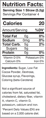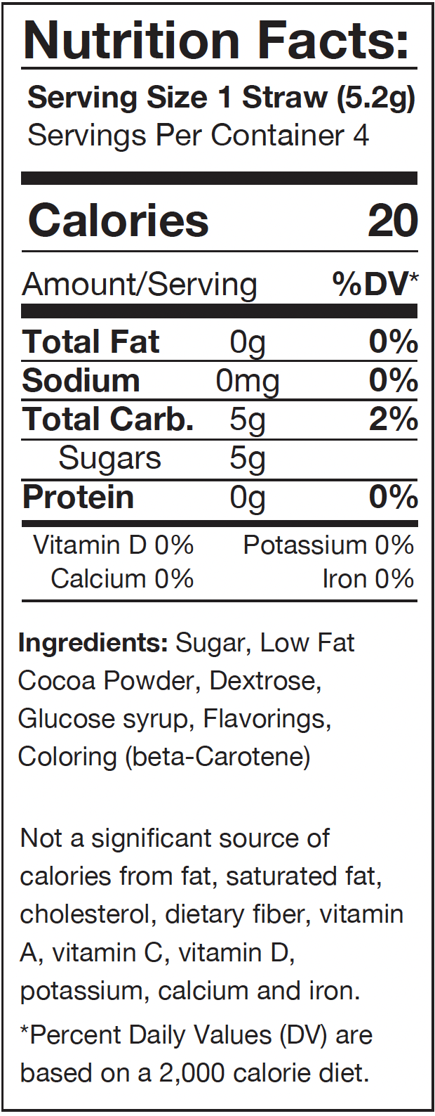 Ingredients: Sugar, Low Fat Cocoa Powder, Dextrose, Glucose syrup, Flavorings, Coloring (beta-Carotene).