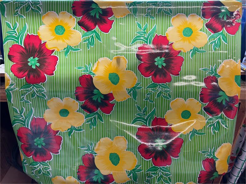 Mali on Green Oil Cloth, YardageOilcloth has been around for over a century and when it comes to making a bold color statement anywhere in your home. Oilcloth is a long-lasting, sturdy product that comes in vibrant colors. The oilcloth of yesteryear was resin-coated vinyl and the finish sometimes cracked or flaked. The new version is made of hi-tech plastic that won't crack but has the same colorful shine. Oilcloth has a mesh backing, which means it can really hold a stitch. It can be used for anything that needs to be durable and colorful--tablecloths, upholstered dining room chairs, curtains, bibs, lampshades, tissue boxes, outdoor chairs, etc. Your only limited by your imagination! Oil Cloth measures 48" wide & a full bolt equals 12 continuous yards (36 feet) Don't see the pattern or color you want? Please let us know and we will order it for you!