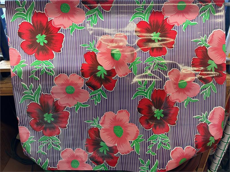 Mali on Purple Oil Cloth, Full BoltOilcloth has been around for over a century and when it comes to making a bold color statement anywhere in your home. Oilcloth is a long-lasting, sturdy product that comes in vibrant colors. The oilcloth of yesteryear was resin-coated vinyl and the finish sometimes cracked or flaked. The new version is made of hi-tech plastic that won't crack but has the same colorful shine. Oilcloth has a mesh backing, which means it can really hold a stitch. It can be used for anything that needs to be durable and colorful--tablecloths, upholstered dining room chairs, curtains, bibs, lampshades, tissue boxes, outdoor chairs, etc. Your only limited by your imagination! Oil Cloth measures 48" wide & a full bolt equals 12 continuous yards (36 feet) Don't see the pattern or color you want? Please let us know and we will order it for you!