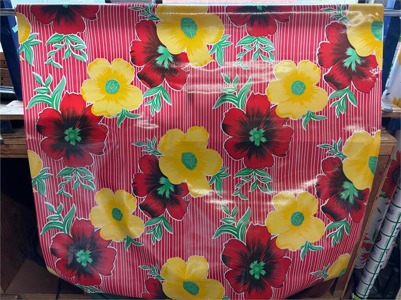 Mali on Red Oil Cloth, YardageOilcloth has been around for over a century and when it comes to making a bold color statement anywhere in your home. Oilcloth is a long-lasting, sturdy product that comes in vibrant colors. The oilcloth of yesteryear was resin-coated vinyl and the finish sometimes cracked or flaked. The new version is made of hi-tech plastic that won't crack but has the same colorful shine. Oilcloth has a mesh backing, which means it can really hold a stitch. It can be used for anything that needs to be durable and colorful--tablecloths, upholstered dining room chairs, curtains, bibs, lampshades, tissue boxes, outdoor chairs, etc. Your only limited by your imagination! Oil Cloth measures 48" wide & a full bolt equals 12 continuous yards (36 feet) Don't see the pattern or color you want? Please let us know and we will order it for you!