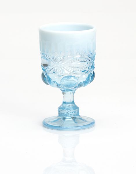 Mosser Glass Aqua & Opal 9 ounce Eye Winker Goblets, Set of 4 #409GAO4Mosser's Eye Winker pattern comes from the Victorian Era of fancy patterned glassware, and is popular today as well. The Eye Winker gets is name due to the oval or eye shaped design in the lower portion of the glassware. The upper portion of the Eye Winker design features vertical ribs. The Eye Winker Goblets hold 9 ounces of liquid, and would make a fancy addition to any table setting. Mosser's Aqua and Opal glass is a translucent light blue glass that finishes off into a opalescent Opal or Milk glass color. A stunning combination. The craftsmen at Mosser Glass have been producing quality American Made Glassware since the 1950s. Mosser Glass produces high quality glassware made with fine craftsmanship. Each piece of Mosser Glass is hand blown and hand finished. Many pieces are made to order. Please allow 1-2 weeks for delivery. Proudly Made in the U.S.A.