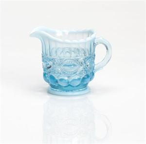 Mosser Glass Aqua Opal Eye Winker Sugar Bowl #409SAOMosser's Eye Winker pattern comes from the Victorian Era of fancy patterned glassware, and is popular today as well. The Eye Winker gets is name due to the oval or eye shaped design in the lower portion of the glassware. The upper portion of the Eye Winker design features vertical ribs. Mosser's Eye Winker Sugar Bowl comes complete with matching lid. A fancy addition to any table setting. The Eye Winker Sugar Bowl with lid measures 3.5" deep x 4.75" high. Mosser's Aqua and Opal glass is a translucent light blue glass that finishes off into a opalescent Opal or Milk glass color. A stunning combination. The craftsmen at Mosser Glass have been producing quality American Made Glassware since the 1950s. Mosser Glass produces high quality glassware made with fine craftsmanship. Each piece of Mosser Glass is hand blown and hand finished. Many pieces are made to order. Please allow 1-2 weeks for delivery. Proudly Made in the U.S.A.