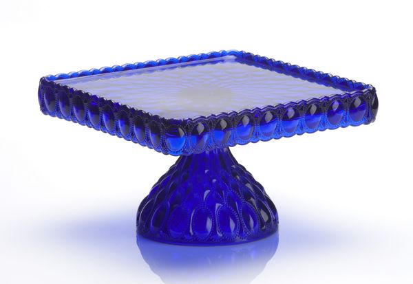Mosser Glass Cobalt Blue Elizabeth Cake Plate #234CPCOBMosser's Elizabeth Style Cake Stand can be used for a variety of displays. From cakes, to cupcakes and appetizers, to savory treats, the embellished Elizabeth style cake plate is a great choice. The Elizabeth Cake Stand is a square topped cake plate with a rounded foot. The Elizabeth design has a crown style embossed design. Mosser's Elizabeth Cake Stand measures 10" wide x 6.5" high. Pair the Elizabeth Cake Stand with Mosser's opalescent or Milk Glass Cake plates for a stunning tablescape. Mosser's Cobalt Blue glass is created by using Cobalt Oxide to create a deep, elegant Cobalt Blue hue. One of the most sought after colors, Cobalt Blue glass lends itself to a variety of decors and settings. The craftsmen at Mosser Glass have been producing quality American Made Glassware since the 1950s. Mosser Glass produces high quality glassware made with fine craftsmanship. Each piece of Mosser Glass is hand blown and hand finished. Many pieces are made to order. Please allow 1-2 weeks for delivery. Proudly Made in the U.S.A.