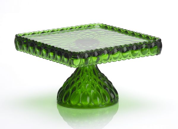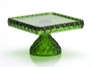 Mosser Glass Hunter Green Elizabeth Cake Plate #234CPHGMosser's Elizabeth Style Cake Stand can be used for a variety of displays. From cakes, to cupcakes and appetizers, to savory treats, the embellished Elizabeth style cake plate is a great choice. The Elizabeth Cake Stand is a square topped cake plate with a rounded foot. The Elizabeth design has a crown style embossed design. Mosser's Elizabeth Cake Stand measures 10" wide x 6.5" high. Pair the Elizabeth Cake Stand with Mosser's opalescent or Milk Glass Cake plates for a stunning tablescape. Mosser's Hunter Green Crystal glass is a rich and deep translucent glass.The Hunter Green glass looks nice in a variety of tablescapes and party themes. The craftsmen at Mosser Glass have been producing quality American Made Glassware since the 1950s. Mosser Glass produces high quality glassware made with fine craftsmanship. Each piece of Mosser Glass is hand blown and hand finished. Many pieces are made to order. Please allow 1-2 weeks for delivery. Proudly Made in the U.S.A.