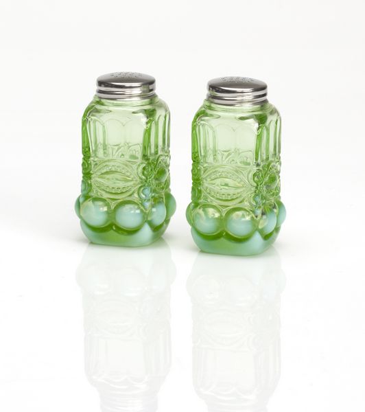 Mosser Glass Green Opal Eye Winker Salt & Pepper Shakers #409S&PGOMosser's Eye Winker pattern comes from the Victorian Era of fancy patterned glassware, and is popular today as well. The Eye Winker gets is name due to the oval or eye shaped design in the lower portion of the glassware. The upper portion of the Eye Winker design features vertical ribs. Mosser's Eye Winker Style shakers are a fancy addition to any table setting. Set of 2 matching shakers, with matching lids. The Eye Winker Style salt and pepper shakers measure 2" deep x 4" high. Shaker lids are imported. Mosser's Green Opal glass is simple elegant. Green Opal transitions from a translucent green glass that finishes off into a opalescent Opal or Milk glass color. A stunning combination. The craftsmen at Mosser Glass have been producing quality American Made Glassware since the 1950s. Mosser Glass produces high quality glassware made with fine craftsmanship. Each piece of Mosser Glass is hand blown and hand finished. Many pieces are made to order. Please allow 1-2 weeks for delivery. Proudly Made in the U.S.A.