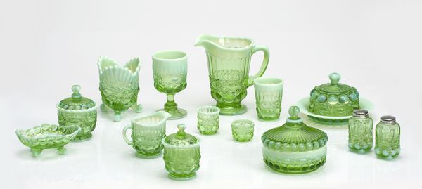 Mosser Glass Green Opal Eye Winker Spoon Holder #409SPGOMosser's Eye Winker pattern comes from the Victorian Era of fancy patterned glassware, and is popular today as well. The Eye Winker gets is name due to the oval or eye shaped design in the lower portion of the glassware. The upper portion of the Eye Winker design features vertical ribs. Mosser's Eye Winker Spooner or Spoon Holder is a fancy spot to put your spoons or other kitchen utensils without messing up your counters. The Eye Winker spoon holder has cute little knob feet and a scalloped top. The spoon rest is a great compliment piece to an Eye winker glassware set. The Eye Winker Spoon Holder measures 4.5" deep x 5.75" high. Mosser's Green Opal glass is simple elegant. Green Opal transitions from a translucent green glass that finishes off into a opalescent Opal or Milk glass color. A stunning combination. The craftsmen at Mosser Glass have been producing quality American Made Glassware since the 1950s. Mosser Glass produces high quality glassware made with fine craftsmanship. Each piece of Mosser Glass is hand blown and hand finished. Many pieces are made to order. Please allow 1-2 weeks for delivery. Proudly Made in the U.S.A.