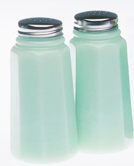 Mosser Glass Jadeite Panel Salt & Pepper Shakers #930JMosser's Panel Style shakers are a straight or flate sided shaker design. The Panel style is a simple design and fits well into many different kitchen decors. The Panel Style is also called a Diner style. Set of 2 matching shakers, with matching lids. The Panel Style salt and pepper shakers measure 1.75" deep x 4.25" high. Shaker lids are imported. Jadeite Glass, also know and Fire King Jade-Ite, is a Jade Green color of opaque milk glass.Popular during the Depression Era, Mosser Glass offers Jadeite Green with today's quality. Jadeite Green is a beautiful color in any kitchen, wedding, or party setting. The craftsmen at Mosser Glass have been producing quality American Made Glassware since the 1950s. Mosser Glass produces high quality glassware made with fine craftsmanship. Each piece of Mosser Glass is hand blown and hand finished. Many pieces are made to order. Please allow 1-2 weeks for delivery. Proudly Made in the U.S.A.